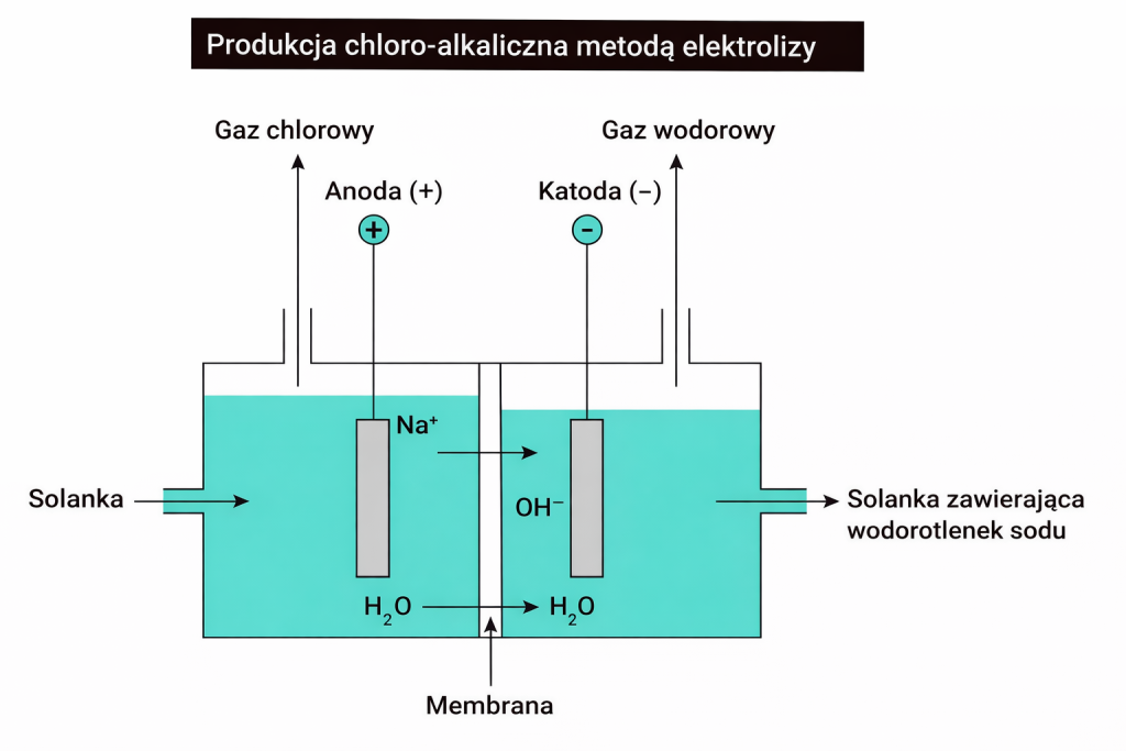 Ług sodowy powstaje w wyniku elektrolizy solanki w procesie chlorowo-alkalicznym. Dzisiejsza technologia membranowa umożliwia produkcję wodorotlenku sodu w sposób bardziej efektywny, bezpieczny i przyjazny dla środowiska niż metody stosowane w przeszłości.